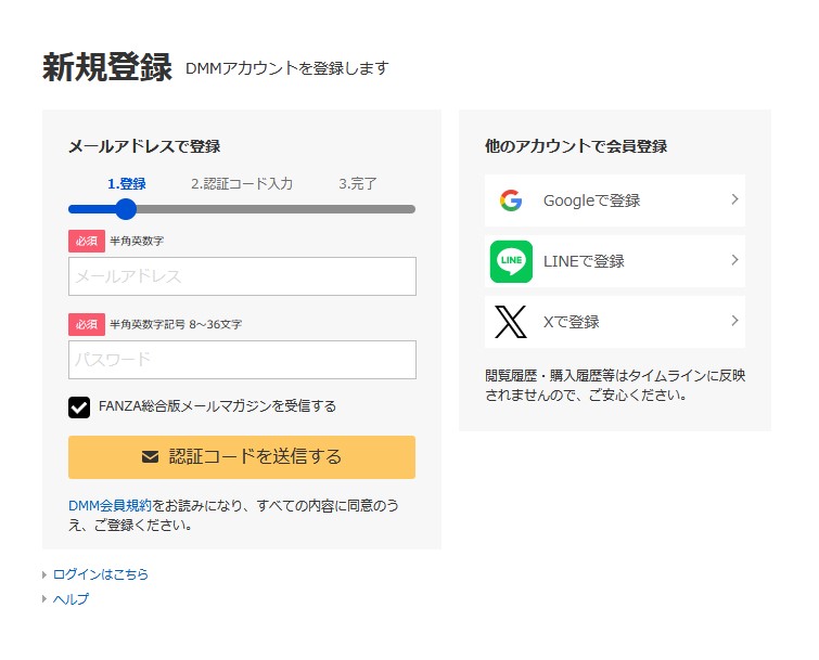 2.新規登録画面でメールアドレスとパスワードを入力して「認証コードを送信する」をクリック