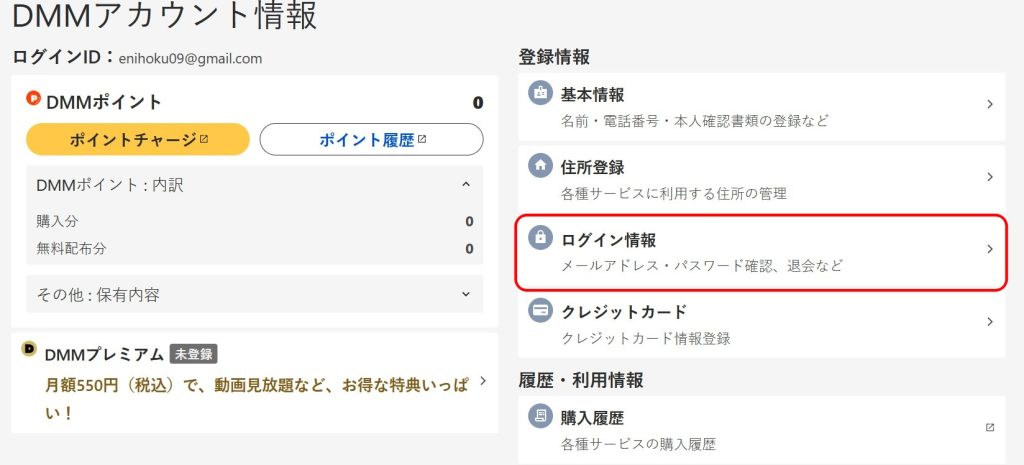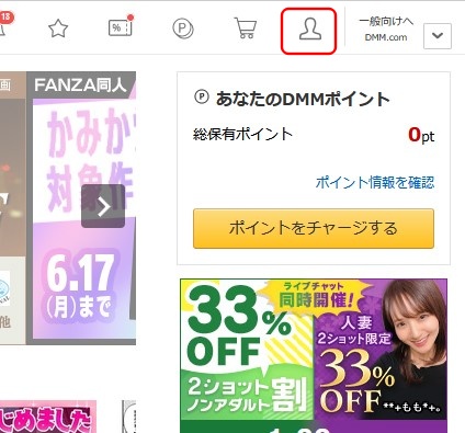 1.ログイン後右上の人型マークにポインタを置くと「DMMアカウント情報」が一番上に出てくるのでクリック
