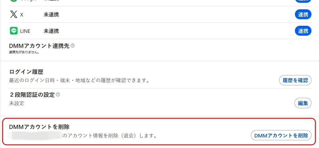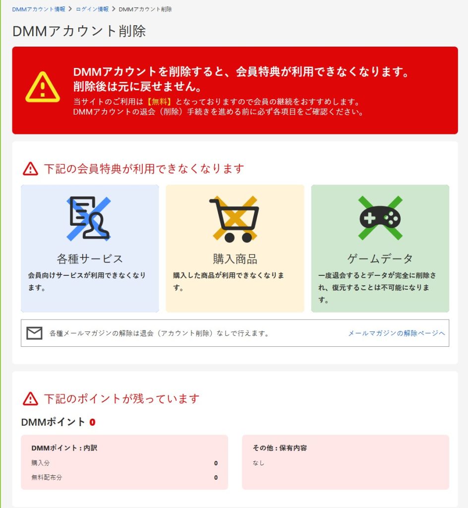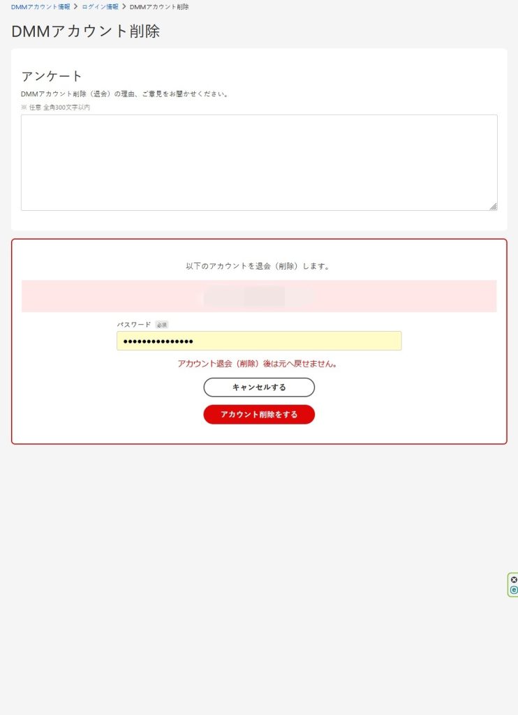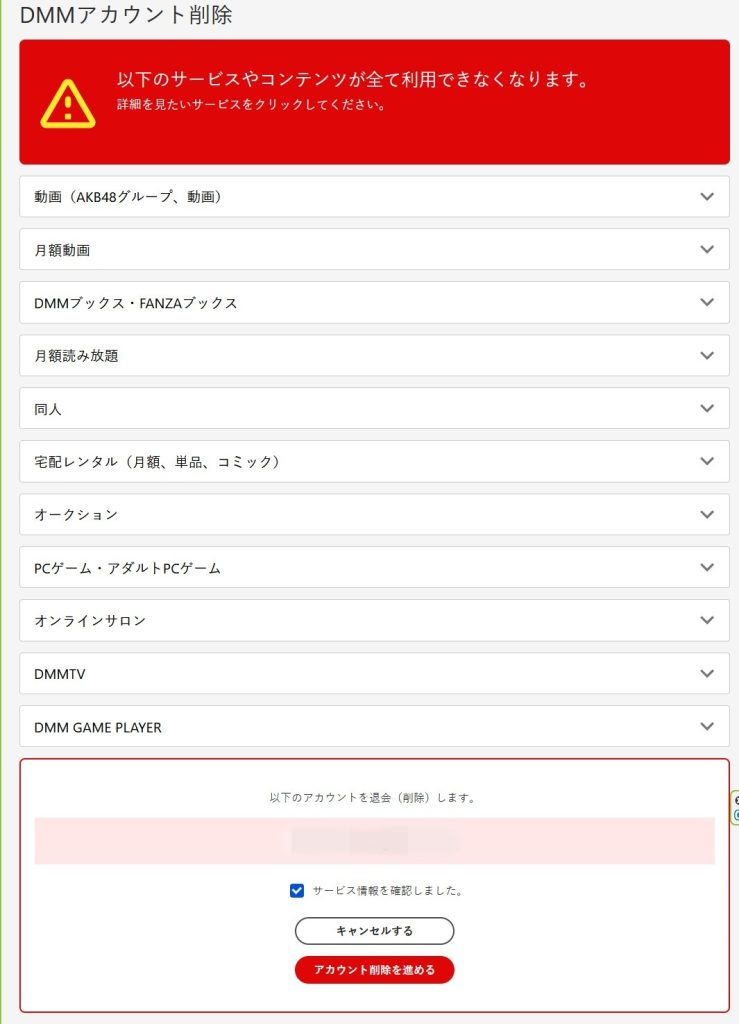 5.DMMアカウント削除画面に遷移するので「サービス情報を確認しました」にチェックを入れて「アカウント削除を進める」をクリック