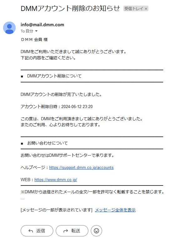 8.メールにもアカウント削除のお知らせが来ているので確認する。これで退会完了。