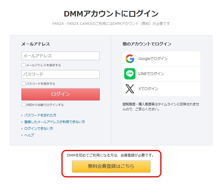 1.FANZAログイン画面にアクセスして「無料会員登録はこちら」をクリック